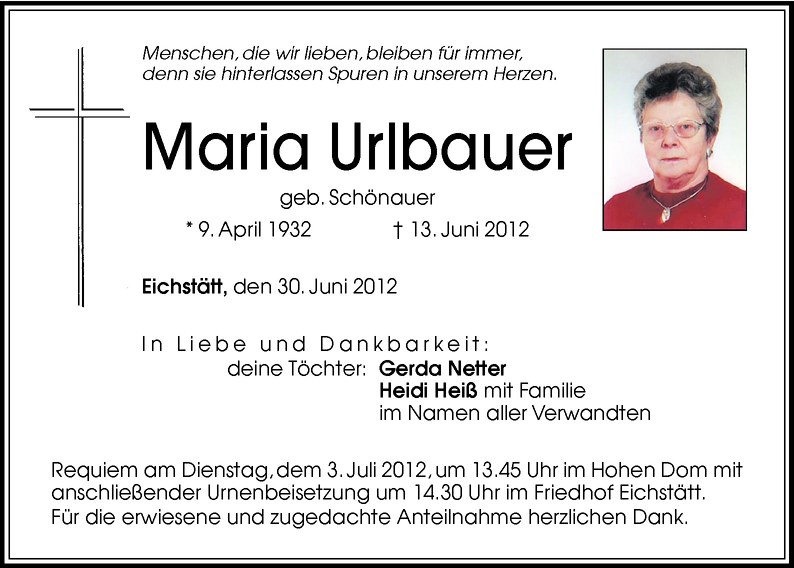 Am 13.06.2012 ist unser langjähriges Mitglied Maria Urlbauer verstorben.